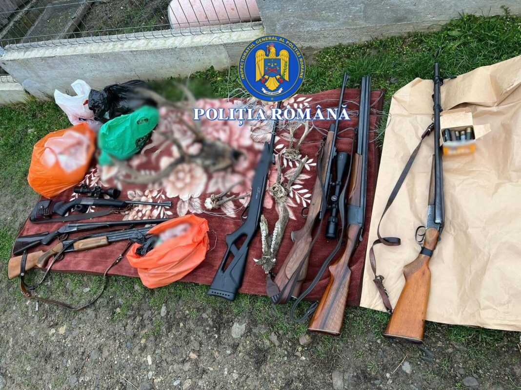 În urma perchezițiilor efectuate la locuințele a patru bărbați, cu vârste cuprinse între 38 și 59 de ani, au fost descoperite și ridicate mai multe arme letale și neletale de vânătoare, muniție aferentă diferitelor calibre, cantități de carne congelată ce par a proveni de la diferite specii de vânat, capcane neautorizate, precum și trofee cinegetice.