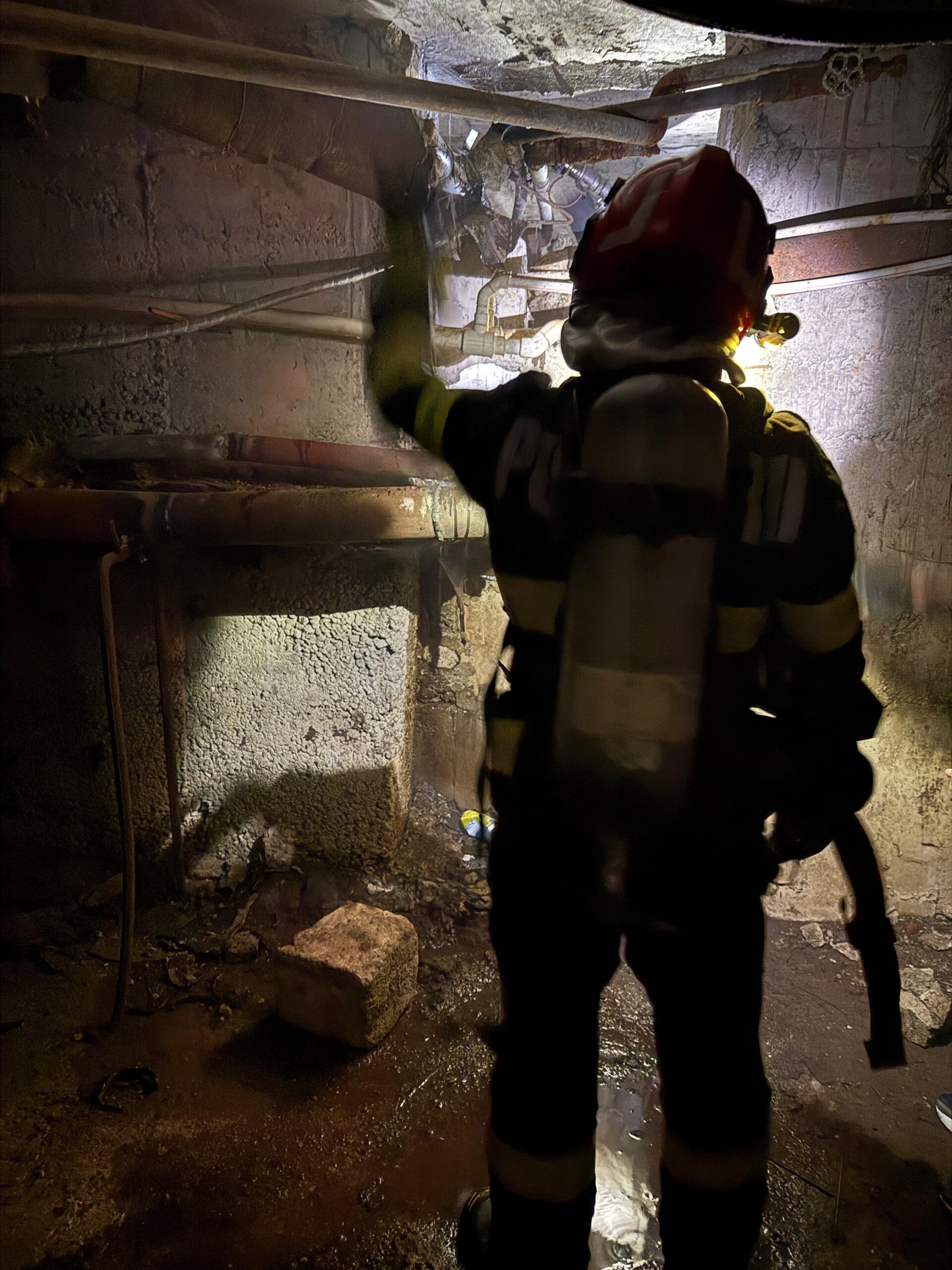 Echipajele operative sosite la locul interventiei au executat o recunoaștere la subsol. A fost identificată o zonă arsă, a unei protectii de țeavă/conductă (în urmă cu 2 zile s-au executat lucrări de sudură). Se continuă verificările și la scări.
