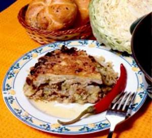 Carnea se trece prin masina de tocat. Compozitia se condimenteaza, se inabusa in ulei pâna scade (se reduce lichidul), se raceste si apoi se trece din nou prin masina de tocat. La pasta rezultata se adauga ouale batute spuma, verdeata taiata marunt si se amesteca pâna devine omogena. Cartofii se prajesc in ulei sau se inabusa intr-o tava unsa cu grasime. Se asaza un strat de cartofi si 1/2 din cantitatea de sos de smântâna care se intinde uniform, apoi stratul de carne si restul de cartofi cu sosul de smântâna. Se introduce tava la cuptor pentru gratinat, timp de cca. 30 de minute. Spre sfârsitul gratinarii se presara deasupra cascavalul ras. Când este gata rumenita, se scoate din cuptor, se portioneaza si se serveste cu sos de tomate pus deasupra.