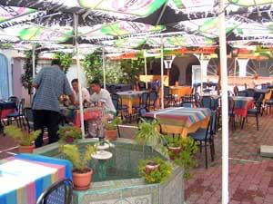La terasa-restaurant Oriental Egipt am gasit o oaza de liniste, cu o fântâna arteziana in mijloc, incrustata cu ornamente arabe. Pe terasa nu sunt decât vreo 20 de mese dichisite cu fete de masa in combinatii de culori extrem de vii: galben, albastru, rosu, verde. Si pentru ca scaunele nu puteau sa faca nota discordanta din punct de vedere coloristic, acestea sunt tapisate in albastru. Atmosfera e calda, potrivita pentru o seara linistita intre prieteni, mai ales ca terasa e dotata cu doua televizoare imense, postate pe doua laturi diferite ale terasei, spre bucuria chibitilor, care pe perioada campionatului pot câstiga tricouri ale nationalei sau pahare de bere.