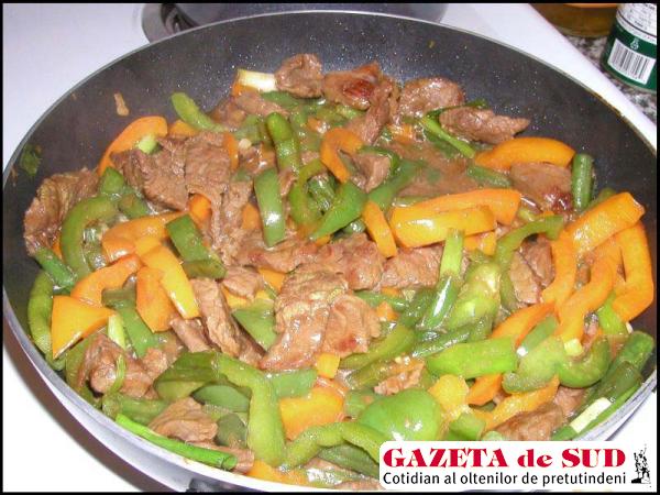 Ingrediente: 400 g de carne de vită, 2 linguri de sos de soia, 2 linguri de vin de orez, o lingură de amidon, o linguriţă rasă de zahăr maro, 2 linguri de ulei, 2 căţei de usturoi, o linguriţă cu vârf de ghimbir pisat, un ardei roşu, un ardei galben/verde, 100 g de mazăre sau fasole verde, 3-4 fire de ceapă verde, 2 linguri de sos de stridii, 3 linguri de apă sau supă.