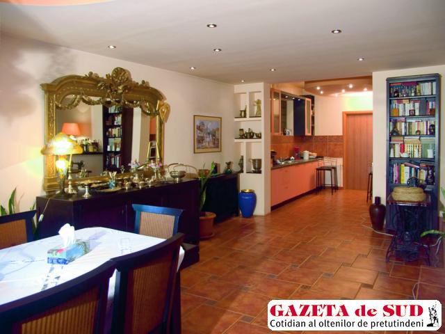 În living, în imediata apropiere a bucătăriei, este o zonă de luat masa, cu mobilier înalt, clasic. Consola este însoţită de o spectaculoasă oglindă cu ramă aurită, care, pe lângă utilitatea imediată, decorativă, este şi o sursă de lumină, reflectând cu generozitate fiecare sclipire sau rază de soare. Are venerabila vârstă de 150 de ani şi a reprezentat un mare punct de încercare atunci când prin restaurare a fost adusă la splendoarea originală.