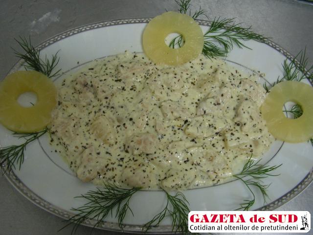 Ingrediente: 200g piept de pui, 100 g ananas, 50 g smântână, busuioc mărunţit, mentă verde mărunţită, 2 căţei de usturoi şi unt.