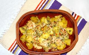Mod de preparare: Se taie pieptul în bucăţi mari, care se pun într-o crăticioară încăpătoare. Se taie ceapa foarte mărunt, mărarul, pătrunjelul şi ardeiul roşu şi se pun în acelaşi vas. Cartofii se curăţă şi se taie în cuburi mari şi se lasă deoparte. Se adaugă peste toate o linguriţă de condimente şi câteva linguri mari de ulei de măsline şi se amestecă.