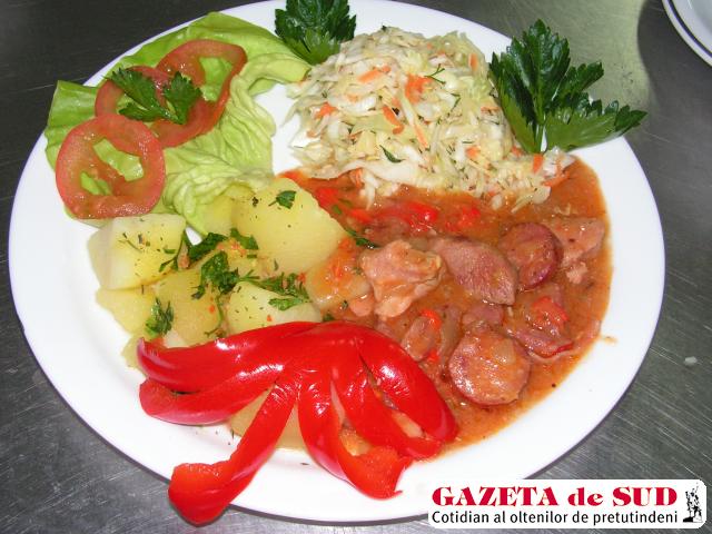 Ingrediente: carne de porc, cârnaţi Debrecen, costiţă afumată, ceapă, roşii, ardei, boia de ardei dulce, smântână.Mod de preparare: Se toacă mărunt ceapa. Se căleşte. Când este aproape gata, se adaugă ardeiul gras, roşiile, boiaua de ardei dulce, cârnaţii căliţi separat, carnea şi şunca, şi ele călite separat.