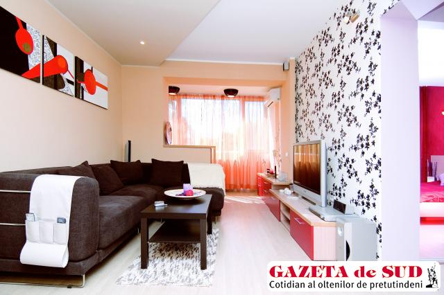 Pentru a nu exista o delimitare între spaţiul livingului şi cel al balconului integrat în cameră, corpul de mobilier foarte jos, pe care este aşezat televizorul, a fost prelungit până în balcon, dând senzaţia de continuitate.