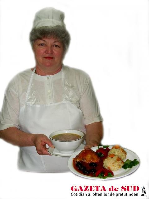 Ingrediente: carne de pui, măsline, pastă de tomate, morcov, ceapă, orez, condimente.