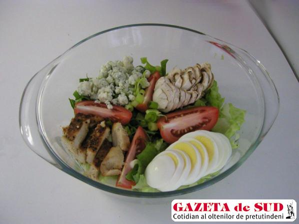 Ingrediente: o salată mică, o bucată de friptură, un ou fiert, o ciupercă proaspătă, 1/2 de roşie mare, 100 g telemea sărată, un fir de ceapă verde.