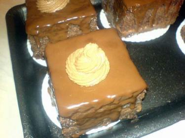 Când se scoate din frigider, se taie prăjitura în câte bucăţi doriţi (mai mari sau mai mici). Acestea se scot pe foaie de copt şi se glazurează cu ciocolată topită.