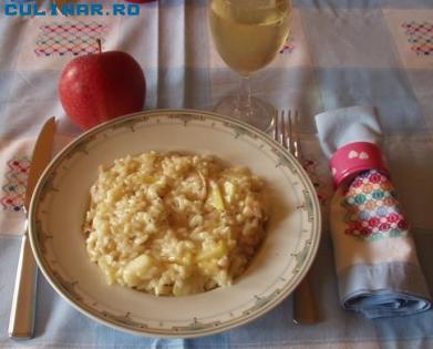 Mod de preparare: Mai întâi se prepară supa pentru risotto. Se pun la fiert 2 morcovi, 4 cartofi, 1 ceapă, tulpinele de pătrunjel şi de ţelină, bucata de carne şi boabe de piper şi cuişoare. Într-o tigaie se pun 2 linguri de ulei şi o linguriţă de unt. Când acesta e topit, se adaugă o ceapă tăiată mărunt şi se lasă câteva minute să se călească. Apoi se adaugă orezul şi se lasă să se prăjească, amestecând până ce devine sticlos. Se adaugă un pahar de vin alb sec. După ce acesta s-a evaporat, se adaugă câte un polonic de supă fierbinte. Trebuie să amestecaţi încontinuu, completând cu câte un polonic de supă. Orezul nu trebuie să rămână nici uscat, dar nici să fiarbă în supă. După 15 minute, adăugaţi un măr tăiat cubuleţe cu tot cu coajă şi mai lăsaţi să fiarbă cinci minute. Când este gata, se adaugă brânza tăiată bucăţele şi se amestecă. Atunci când aceasta s-a topit, se ia de pe foc şi se serveşte, după preferinţă, cu verdeaţă.