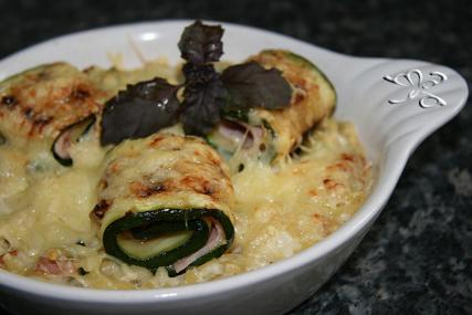 Se amestecă uşor feliile. Se pune câte o fâşie de şuncă pe o felie de dovlecei şi se rulează. Pastele fierte se pun într-un vas termorezistent, deasupra se toarnă sosul, se amestecă. Se aşază apoi rulourile, se presară caşcaval şi se mai dă pentru câteva minute la cuptor. Se serveşte cald.