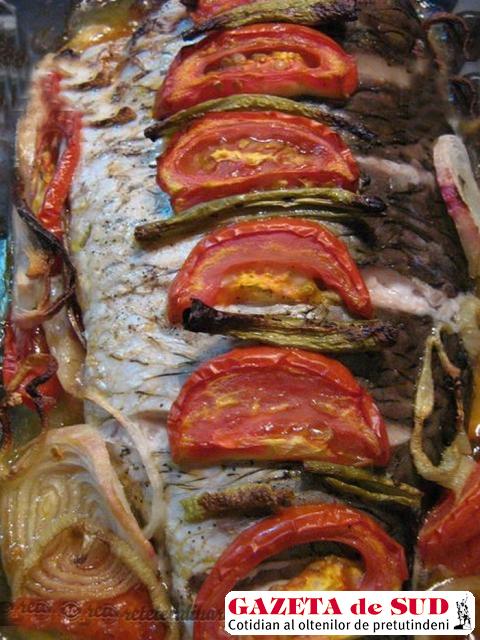 Se curaţă peştele, se spală bine. Legumele se taie felii. Se unge un vas termorezistent cu ulei şi se pune un strat de rondele de morcov. Peştele se condimentează cu sare şi piper şi se pune deasupra. În interiorul lui se pun 2-3 felii de roşii, 1 felie de ceapă şi 2 felii de lămâie. Restul legumelor se aşază pe lângă peşte şi deasupra. Se stropeşte totul cu puţin ulei de măsline şi se ţine la cuptor aproximativ 30 de minute.