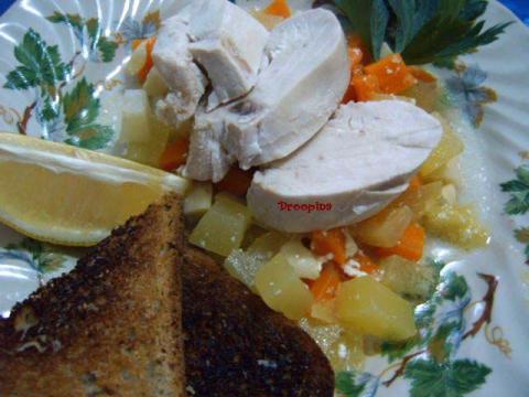 Mod de preparare: Se fierb ceapa, usturoiul şi lămâia până se întrepătrund mirosurile, apoi se adaugă şi pieptul de pui. După ce a fiert, se scoate pe o farfurie, se acoperă şi se lasă să se răcească. Zeama se strecoară şi se pune din nou pe foc până se evaporă apa şi cantitatea scade cam la jumătate. Se adaugă legumele şi se lasă să fiarbă cât să devină puţin crocante. Se toarnă vinul şi frişca şi se mai lasă să scadă. Când sunt gata, pieptul se aşază pe farfurie alături de legume şi se serveşte cu bruschette.