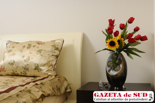 Dormitorul de oaspeţi, mai puţin spectaculos din punct de vedere al finisajelor, propune o amenajare plăcută şi luminoasă, în nuanţe deschise, cu modele florale. Baia păstrează acelaşi stil minimalist şi aceeaşi cromatică, reluând modelul liniilor drepte, ce se continuă pe tavan sub formă de scafă.