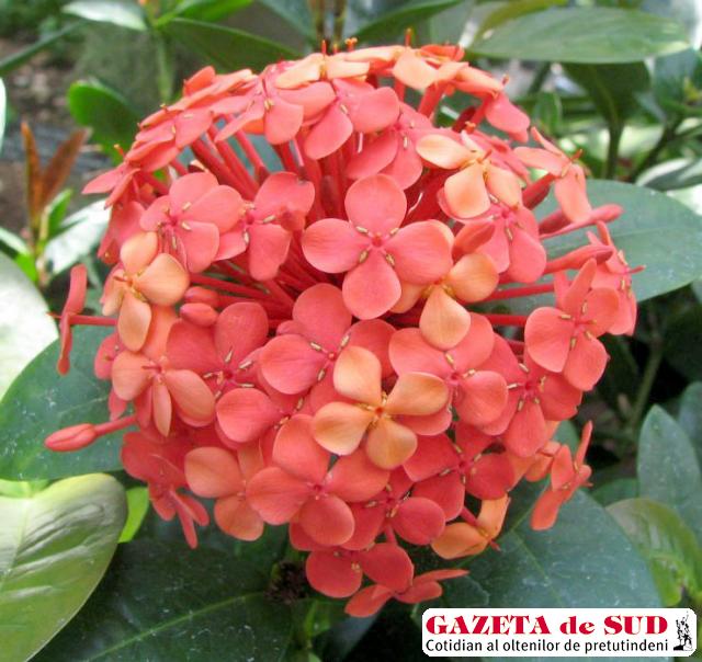 Ixora este un arbust mereu verde, originar din India. În natură, această plantă poate ajunge până la 120-150 de centimetri înălţime, dar când este cultivată în vas nu depăşeşte 50-60 de centimetri. Ixora mai este numită şi Flacăra pădurilor datorită florilor sale în culori aprinse, de la galben-portocaliu până la roşu. Este o plantă pretenţioasă, având nevoie de căldură, lumină multă şi umiditate constantă. Are tulpini subţiri, lemnoase, de culoare maro închis, iar frunzele sunt ovale şi lucioase. Vara produce inflorescenţe alcătuite din flori de dimensiuni mici, cu patru petale. Acestea nu se evidenţiază prin parfum, care este foarte discret, ci prin culorile aprinse precum roşu, roz, galben, alb sau portocaliu. Ixora este o plantă care atrage totdeauna atenţia. Chiar dacă nu este uşor de îngrijit, merită să o achizitionaţi deoarece vă va înfrumuseţa locuinţa.