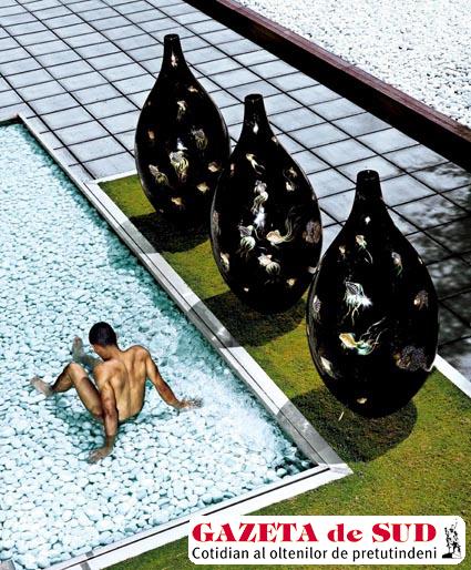 Puritatea albului absolut accentuează forma vaselor conice din răşină, care au în relief frunze de lotus stilizate. Acelaşi efect este dat şi tapetului.