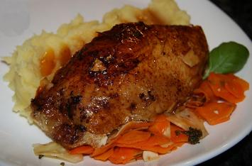 Mod de preparare: Curăţaţi şi spălaţi morcovii, ţelina, pătrunjelul, apoi tăiaţi-le foarte subţire şi amestecaţi-le cu 1-2 linguri de ulei de măsline, sare, piper, boia şi zeamă de lămâie. Umpleţi puiul, prindeţi-l cu trei ace din inox pentru rulade, condimentaţi-l şi puneţi-l în vasul termorezistent, în vin. Înainte de a-l băga la cuptor, turnaţi puţin ulei de măsline peste el. Se coace aproximativ două ore. Când începe să se rumenească, acoperiţi vasul cu folie de aluminiu, pe care o scoateţi spre final. Din vin şi sucul lăsat de pui şi legume va ieşi un sos excelent. Puiul se poate servi cu piure de cartofi.