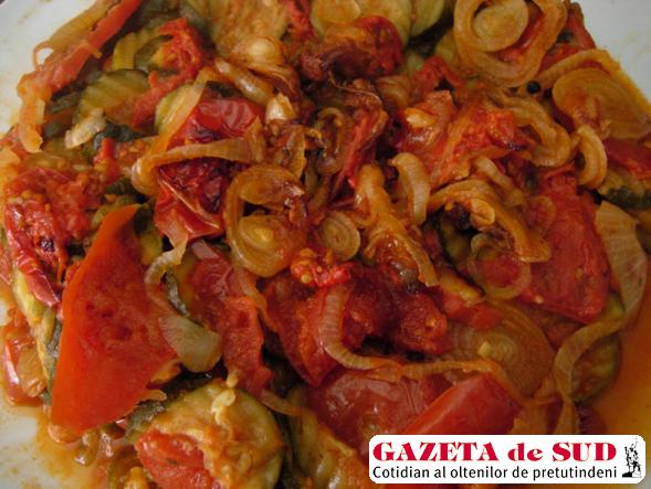 Ingrediente: dovlecei, ceapă, roşii, ulei de măsline, usturoi, câteva boabe de piper.