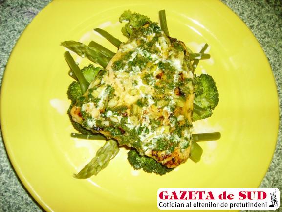 Mod de preparare: Aşezaţi fileurile într-un vas din porţelan. Amestecaţi restul ingredientelor şi turnaţi peste peşte. Lăsaţi să stea la marinat timp de o oră. Încingeţi o tigaie antiaderentă sau un grătar şi frigeţi peştele timp de 4 minute pe fiecare parte, turnând deasupra marinata rămasă. Puteţi servi peştele cu garnitură de linte verde, sote de spanac, de legume sau de broccoli, fasole verde, sparanghel.