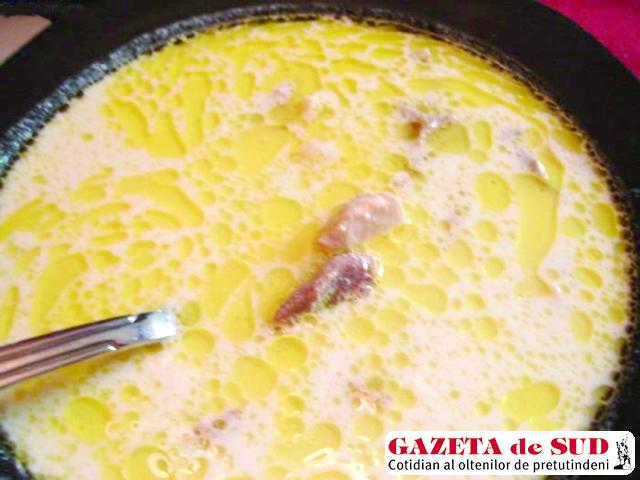 Mod de preparare: Se taie carnea în bucăţi mici şi se pune la fiert împreună cu legumele. În apă se pune şi o lingură şi jumătate de sare. Se lasă să fiarbă la foc potrivit. Ciorba se spumează şi se pun în ea boabele de piper şi căţeii de usturoi. După ce a fiert carnea, se strecoară ciorba printr-o sită foarte deasă, ca să fie cât mai limpede. Se curăţă carnea de pe oase şi se taie fâşii. Se pun apoi într-un castron mai mare 1 kg de smântână (20 la sută grăsime) şi 3 linguri de făină. Se bat bine cu telul, adăugând din când în când câte un polonic de ciorbă. Se toarnă amestecul cu smântână în oală, se pune carnea şi se dă din nou ciorba la foc mic. Se potriveşte de sare şi piper (se pune doar piper alb, deoarece ciorba trebuie să rămână albă). Se face mujdei de usturoi şi se strecoară într-un castron, peste el turnându-se câteva polonice de ciorbă. Acest amestec se pune şi el în oală şi se lasă ciorba să mai fiarbă puţin. Se acreşte cu 2 linguri de oţet. Se serveşte cu ardei iute.