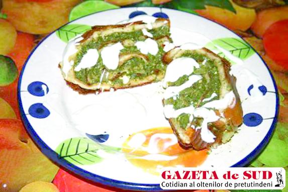 După ce s-a răcit amestecul, se adaugă cele 4 gălbenuşuri, sare, piper, iar la sfârşit albuşurile bătute spumă. Se pune în tavă hârtie de copt şi se întinde aluatul. Se bagă în cuptorul preîncălzit şi se coace 30 de minute, din care primele 10 la foc mare, apoi la foc mediu spre mic. Nu se deschide uşa cuptorului 20 de minute. După ce s-a copt, se scoate aluatul fierbinte cu hârtie cu tot, se unge cu umplutura şi se rulează cu ajutorul hârtiei pe care s-a copt. Rulada, odată umplută, trebuie să stea acoperită ca să nu se usuce. Se poate reîncălzi în cuptorul cu microunde.