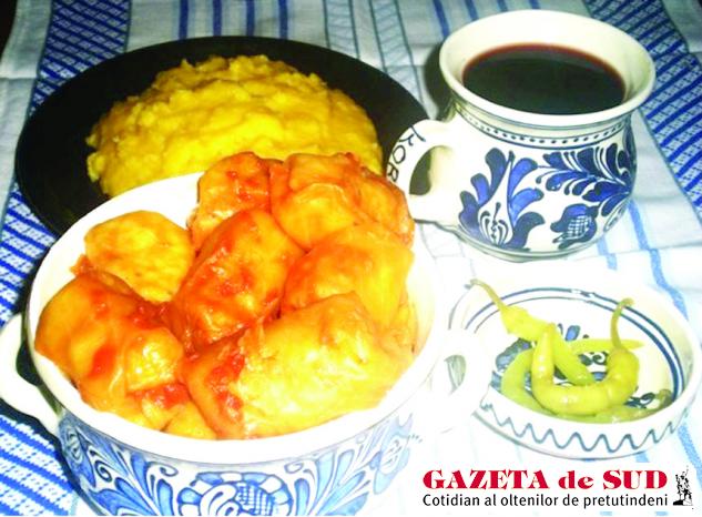 Ingrediente: 1 cană de orez cu bobul rotund, 400 g de ciuperci, 300 g de boabe porumb fierte, 2 cepe potrivite, 2 morcovi, frunzele de la o varză acră de 800 g – 1 kg, 2 linguri de ulei, 1 lingură vegeta, sare, piper, 500 g de suc de roşii, 4 căni de apă (sau cât este nevoie până se fierbe varza).