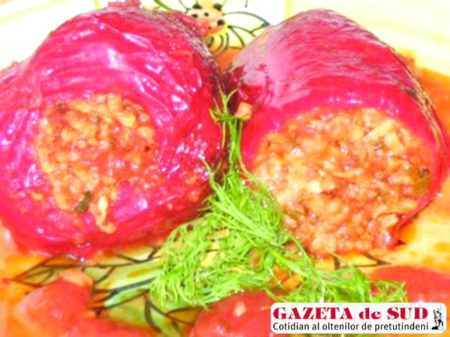 Se lasă la răcit, se adaugă verdeaţa tocată şi se potriveşte de sare şi piper. Ardeii se spală, li se taie câte un căpăcel în jurul codiţei, se curăţă de seminţe, se spală iar şi se lasă la scurs. Se umplu cu amestecul de orez şi ciuperci, se ung cu ulei şi se aşază în tavă. Se pun felii de roşii printre ei şi se dau la cuptor, la foc mic, 45 de minute. Cu zece minute înainte de a fi scoşi de la cuptor, se poate turna peste ei sos de roşii.