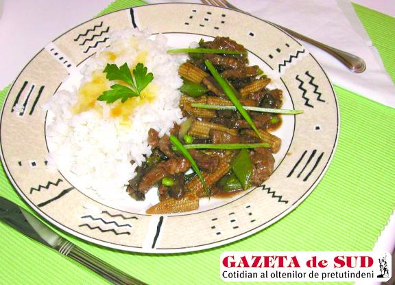 Ingrediente: 400 g carne fragedă de vită, 125 g ciuperci, 100 g muguri de porumb din conservă, 125 g mazăre congelată, 1 linguriţă de ghimbir tocat, 1 fir de ceapă verde, 2 linguri vin de orez, 2 linguri amidon, 2 linguri sos de stridii, 1 lingură sos de soia, 1 linguriţă zahăr maro, 1/4 linguriţă sare, 2-3 linguri ulei pentru prăjit.