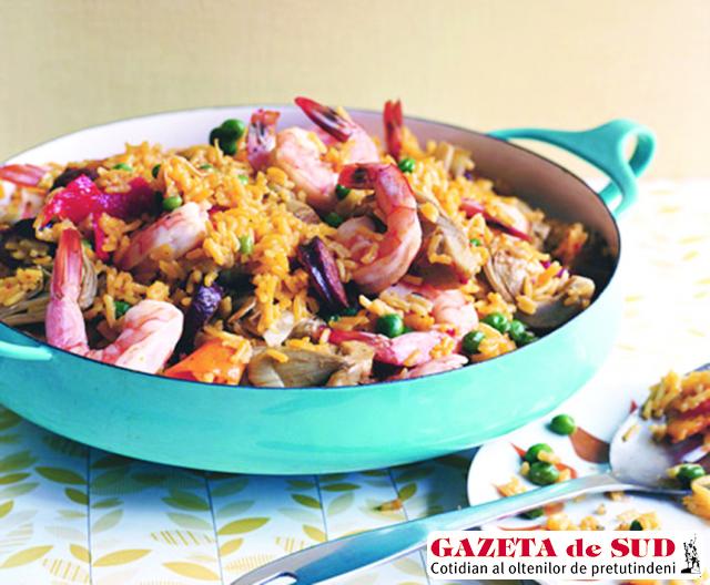 Ingrediente: 400 g cârnaţi chorizo tăiaţi bucăţi, 4 linguri de ulei de măsline, 450 grame de orez cu şofran, 250 g anghinare, 200 g ardei copt feliat, 2 căni de supă de pui sau peşte ori 2 căni de vin, 450 g creveţi decorticaţi, 250 g de mazăre, sare şi piper.