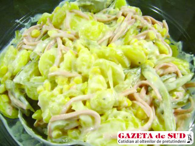 Ingrediente: 500 g cartofi, 300 g şuncă presată, 5 castraveţi muraţi, 1/2 cutie de porumb, 200 g iaurt, 3 linguri de sos de salată, 3 linguri de oţet de la castraveţi, o ceapă tăiată julien, sare, piper.