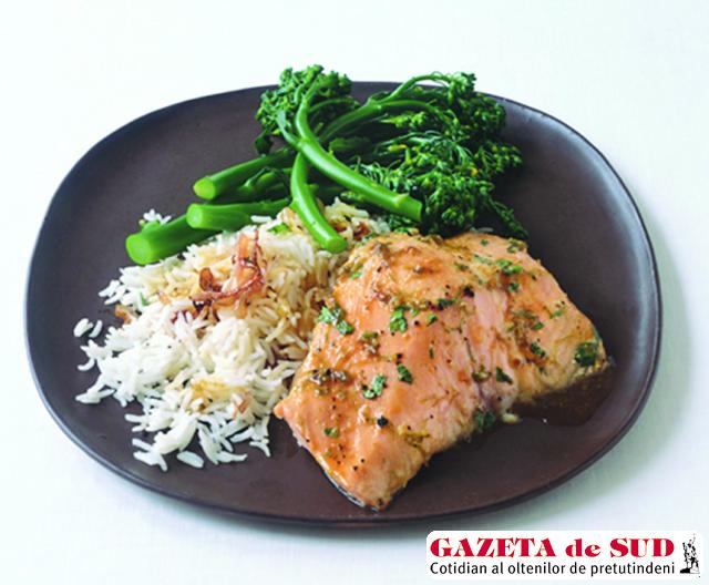 Ingrediente: 1/4 cană de zeamă de lămâie verde, 2 linguri de coajă de lămâie verde rasă, 2 linguri de miere, 2 linguri de coriandru tocat, 4 linguriţe de sos de soia, 1 lingură de ulei de măsline, 3/4 cană de ceapă tocată, o cană şi jumătate de orez basmati, 4 căni de supă de pui, 4 bucăţi de somon, inflorescenţele de la un buchet de broccolini (baby broccoli), sare, piper.