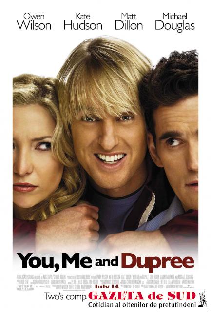 „You, Me and Dupree“ este povestea unui tânăr simpatic, bine intenţionat, dar reţinut, care-şi scoate din minţi prietenii. Carl şi Molly întâmpină un singur obstacol nefericit în noua lor lume a căsătoriei, construită atât de perfect: Dupree. Un leneş cu suflet de poet, Dupree nu pare să ia nici o pauză de la The Man. Atunci când îşi ia o săptămână liberă pentru a merge la nunta celui mai bun prieten, în Hawaii, şeful lui Dupree îi dă de înţeles acestuia că-şi va pierde slujba. Fără un loc de muncă, fără maşină şi evacuat din casa în care locuia, acesta trebuie să stea cu familia Peterson. Pentru început, Carl este încântat să-l aibă ca oaspete pe Dupree, în timp ce Molly trebuie să-şi reprime furia şi să asculte povestirile bine intenţionate ale lui Dupree. Dar, cu cât Carl se cufundă mai mult în afacerea lui în plină dezvoltare în construcţii, acesta îşi dă seama că este greu să facă faţă şi lui Dupree şi noilor sale responsabilităţi. Cu cât timpul trece, oaspetele lui şi al lui Molly devine o companie pentru aceasta din urmă. Chiar şi tatăl lui Molly începe să fie încântat de înţelepciunea lipsită de griji a lui Dupree, frustrându-l pe Carl tot mai mult.