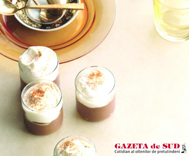 Ingrediente: 2 ceşti de lapte integral, 3 linguri de granule de cafea instant, 2 linguri şi 2 linguriţe de amidon de porumb, 100 grame de zahăr, 1/2 ceaşcă de frişcă, 1/4 linguriţă de esenţă de vanilie, praf de scorţişoară, sare.