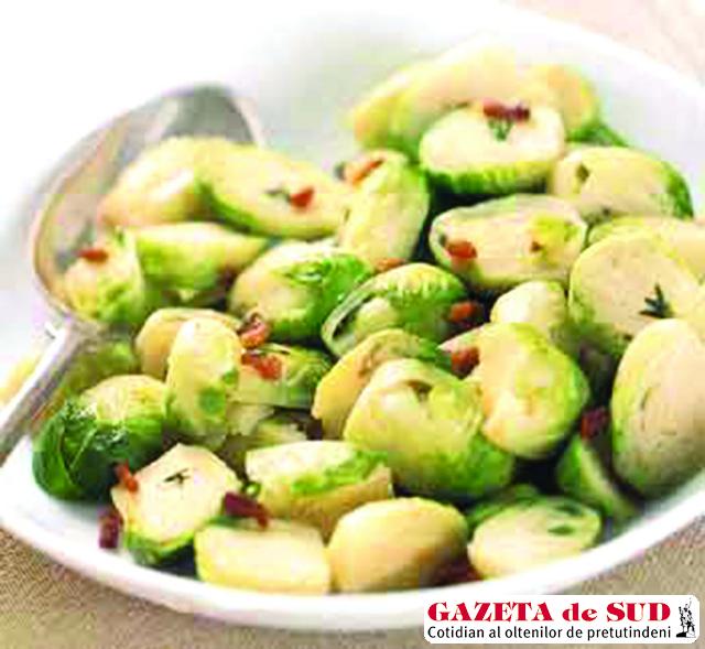 Ingrediente: 500 g varză de Bruxelles (căpăţânile trebuie tăiate pe jumătate), 2 felii de bacon tăiate mărunt, 1 lingură de cimbru proaspăt tocat, sare, piper.