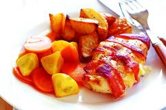 Ingrediente (pentru 2 porţii): 2 cartofi mici, tăiaţi în patru, 3 linguri de ulei de măsline, o bucată de file din piept de pui, 1 felie de caşcaval, tăiată în patru, 2 felii de bacon tăiate în două pe lungime, un morcov fiert, 2 dovlecei mici fierţi, sare şi piper