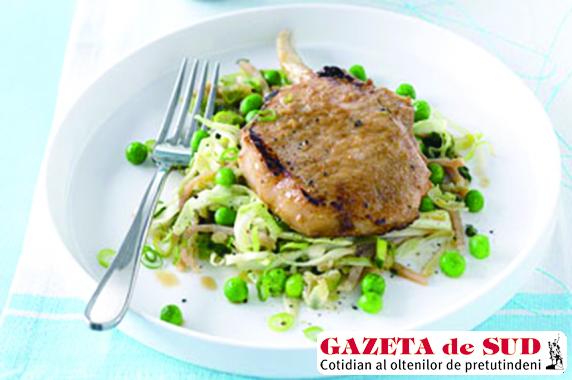 Ingrediente (pentru 4 porţii): 1/4 cană suc de mere, 2 linguri sos de soia, 4 cotlete de porc, 2 linguriţe ulei de măsline, 4 fire de ceapă verde tocate mărunt, 1 căţel de usturoi pisat, 4 bucăţi de şuncă tăiate foarte subţire, 2 căni de varză tocată, 2 căni de mazăre congelată.