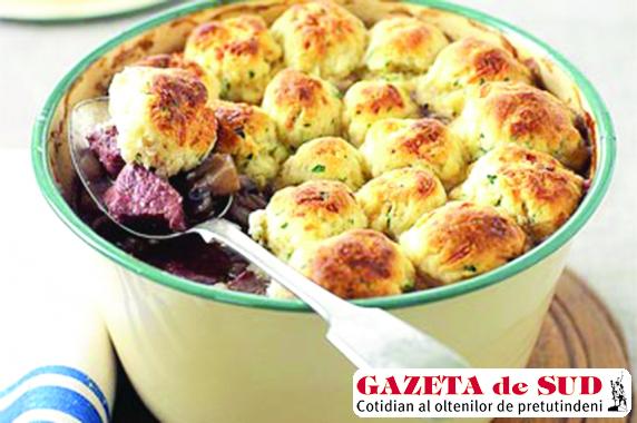 Mod de preparare: Tăiaţi carnea de vită în bucăţi de aproximativ 2 cm şi rumeniţi-o în uleiul de măsline, la foc mediu. Scoateţi carnea pe un platou. În tigaie puneţi ceapa tocată, şunca tăiată mărunt, ciupercile tăiate pe jumătate şi usturoiul, şi lăsaţi totul pe foc până când ingredientele se înmoaie, apoi încorporaţi făina. Adăugaţi supa de vită, vinul, cimbrul şi foile de dafin şi daţi totul în clocot. Micşoraţi focul, adăugaţi carnea de vită şi fierbeţi preparatul acoperit, timp de o oră şi jumătate, apoi transferaţi totul într-un vas termorezistent. Preîncălziţi cuptorul la 200°C. Între timp, amestecaţi untul, făina cu agent de creştere, parmezanul şi laptele, până când se omogenizează. Modelaţi compoziţia sub formă de găluşte şi puneţi-le peste carne. Mai daţi totul la cuptor timp de 20 de minute şi apoi serviţi.