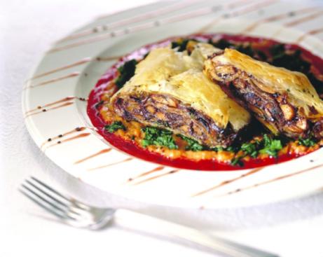 Se frământă aluatul din făină, sare, unt şi gălbenuşuri. Se acoperă cu o folie de aluminiu şi se pune la rece. Se călesc morcovii, ceapa şi usturoiul în unt încins. Se adaugă şi ciupercile de la început pentru că lasă multă apă. Se taie chifla cubuleţe şi se înmoaie în lapte. Într-un castron adânc, se amestecă bine carnea tocată de miel cu legumele călite şi răcite, chifla bine scursă şi smântâna. Se potriveşte de gust cu pătrunjel, condimente şi vin roşu.