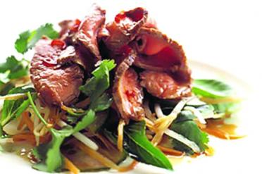 Ingrediente (pentru 4 porţii): 2 fileuri de miel (600 g), 2 ardei iuţi roşii, un căţel de usturoi, 50 g zahăr de palmier, 175 ml oţet aromat, 1 castravete, 1 morcov, 1 ridiche albă, 1/2 cană de frunze de mentă proaspete, 1/2 cană de frunze de coriandru, 100 g fasole verde, 2 linguri de ulei de măsline, sare şi piper.