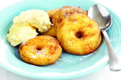Ingrediente (pentru 4 porţii): 2 mere roşii, 95 g făină cu agent de creştere, 55 g zahăr pudră, un vârf de cuţit de sare, 125 ml de lapte, un ou, 2 linguri de zahăr de glazurare, praf de scorţişoară pentru decor, îngheţată de vanilie pentru servirea desertului.