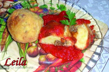 Ungem mâna cu un pic de ulei, luăm din cartofii zdrobiţi cu o lingură, aşezăm în palmă, aplatizăm, punem 1 lingură din compoziţia de carne şi deasupra aşezăm alt strat de cartofi zdrobiţi, apoi modelăm un bulgăre.