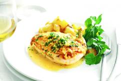Ingrediente (pentru 4 porţii): 4 fileuri din piept de pui, cu piele, 700 g cartofi, 30 g unt nesărat, 2 linguri de ulei de măsline, 3 cepe mici, 2 căţei de usturoi, 125 ml supă de pui, 2 linguriţe de muştar Dijon, 1 lingură de sos Worcestershire, 60 ml coniac, 125 ml smântână groasă, 2 linguri de pătrunjel, 2 linguriţe de zeamă de lămâie, sare şi piper.