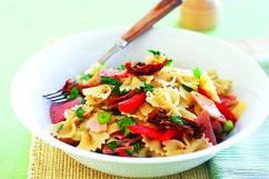 Ingrediente (pentru 4 porţii): 375 g paste, 300 g şuncă slabă, 180 g roşii uscate, un ardei gras roşu, 4 fire de ceapă verde, 2 linguri de pătrunjel, 2 linguri de ulei de măsline, 2 linguri de oţet din vin alb, o lingură de muştar cu granule, o lingură de miere, sare şi piper.