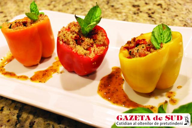 Pentru acest preparat colorat folosiţi ardei graşi galbeni şi roşii. Umplutura va fi făcută din sos de măsline, carne tocată de vită, dovlecei, usturoi pisat, scorţişoară, chimion şi stafide. Umpleţi ardeii şi daţi-i la cuptor până când legumele se înmoaie.