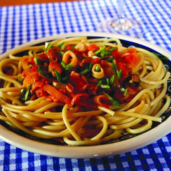 Ingrediente: 1 cârnat mare, proaspăt, neafumat, dulce, un cârnat proaspăt, mare, neafumat, picant, o ceapă mare, tocată, doi căţei usturoi, 600 g roşii întregi la conservă, ulei de măsline, 450 g spaghetti, sare, după gust, brânză parmezan, dată prin răzătoare.