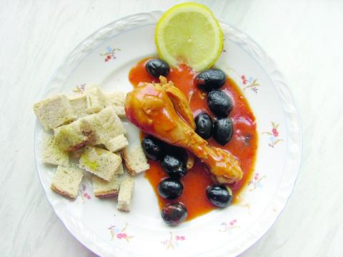 Mod de preparare: Se ia un pui, se împarte în opt bucăţi. Se pot folosi aripile şi pulpele superioare, dar orice parte a puiului este bună. Se rumenesc în ulei, preferabil de măsline. Se pun măslinele la fiert separat, cam 15 minute. Se scoate puiul rumenit pe o farfurie şi se scurge cea mai mare parte din grăsime. Se taie bucăţele de pâine şi se fac crutoane (fie se dau bucăţelele de pâine la cuptor, fie se prăjesc în uleiul rămas de la pui). Se pune puiul în tigaie, se amestecă pasta de tomate cu făina şi se dizolvă cu apă rece adăugată treptat, apoi se pune în tigaie cât să acopere bucăţile de pui. Se pun măslinele scurse de apa în care au fiert, usturoiul mărunţit şi sare şi piper după gust. Sosul se lasă să se îngroaşe, se adaugă vinul şi se lasă să mai dea un clocot, se potriveşte de sare. Se poate servi fie cu crutoane şi cu o felie de lămâie, fie se mai dă 15 minute la cuptor.