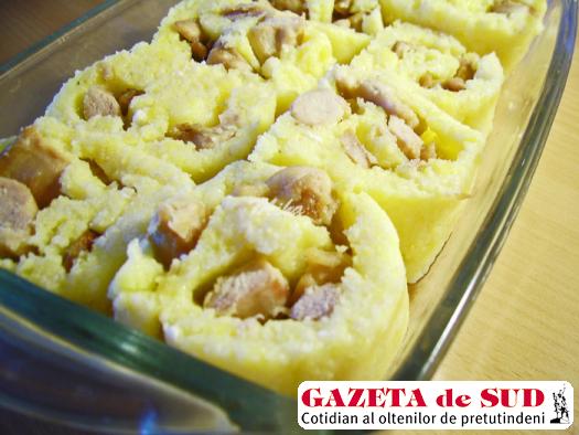 Repartizaţi carnea pe toată suprafaţa foii de mămăligă şi rulaţi, ajutându-vă de folia alimentară. Ruloul obţinut tăiaţi-l în bucăţi de aproximativ 4-5 cm, pe care puneţi-le într-un vas termorezistent uns cu unt. Puneţi pe fiecare rulou câte o linguriţă de smântână şi daţi la cuptor, la foc mediu, pentru 10-15 minute.