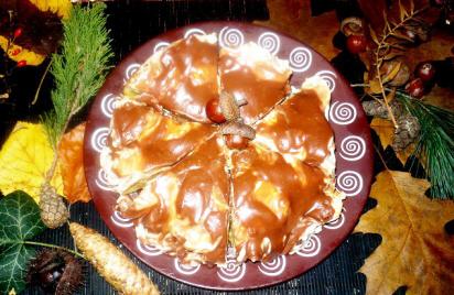 Ingrediente: 5 mere, 10 castane, 5 nuci, 3 ouă, 200 g făină, 4 linguri zahăr, 1/2 pachet zahăr pudră cu aromă vanilie, 50 g unt, 2 ciocolate cu caramel Milka, 1 cutie cremă de brânză cu smântână, 3 linguri smântână, 150 ml suc de mere verzi, 1 plic gelatină transparentă, 1 praf de copt.