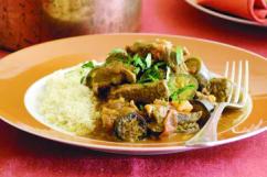 Ingrediente (pentru 4 porţii): 600 g carne de vită, 2 linguri de ulei de măsline, 2 căţei de usturoi, 1/2 linguriţă de praf de ghimbir, 1/2 linguriţă de scorţişoară măcinată, 1 linguriţă de şofran, 1 linguriţă de boia, 1 linguriţă de chimion măcinat, 800 g roşii, un ardei iute, 4 vinete mici, sare şi piper.