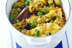 Ingrediente (pentru 4 porţii): 8 pulpe inferioare de pui, 2 linguri de ulei de măsline, o ceapă, un ardei gras, 2 căţei de usturoi, o linguriţă de şofran, 2 linguriţe de chimion, 2 linguriţe de boia dulce, 2 beţe de scorţişoară, 1/4 linguriţă praf de chilli, 1/2 cană de vin alb sec, 400 g roşii din conservă, 1 1/2 cană de supă de pui, o cană de orez, pătrunjel şi măsline.